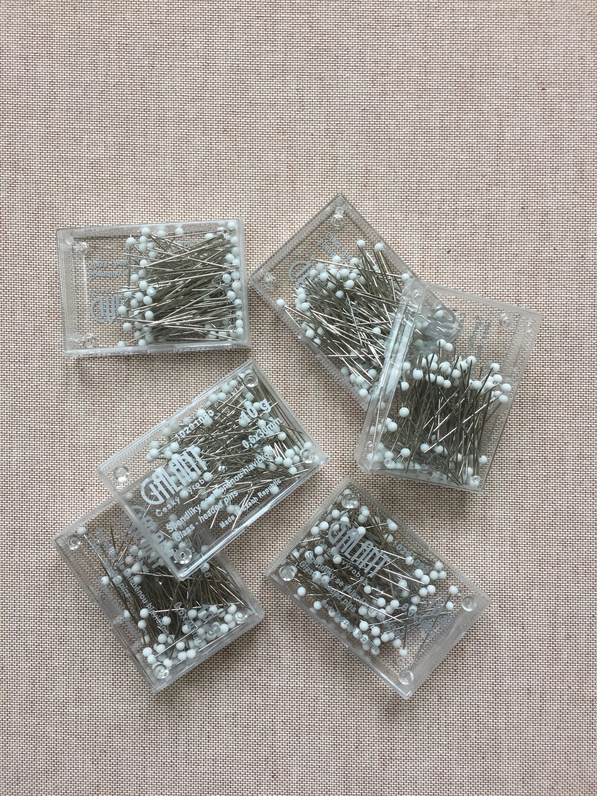 10 gr. knappenåle med hvidt glashoved.